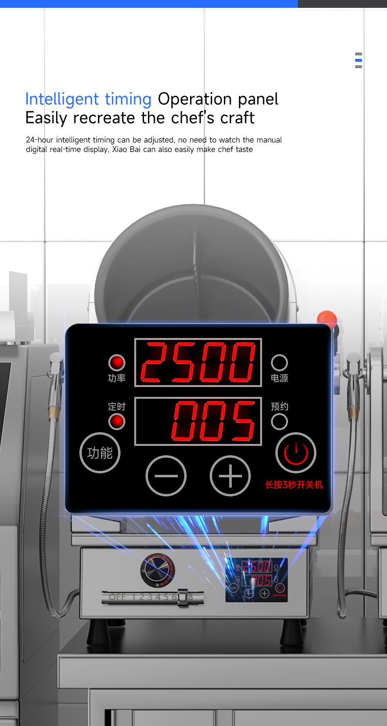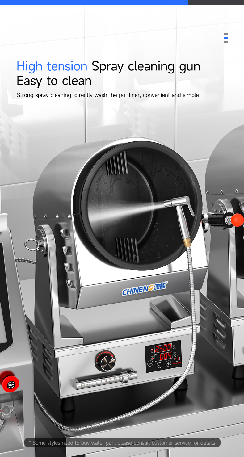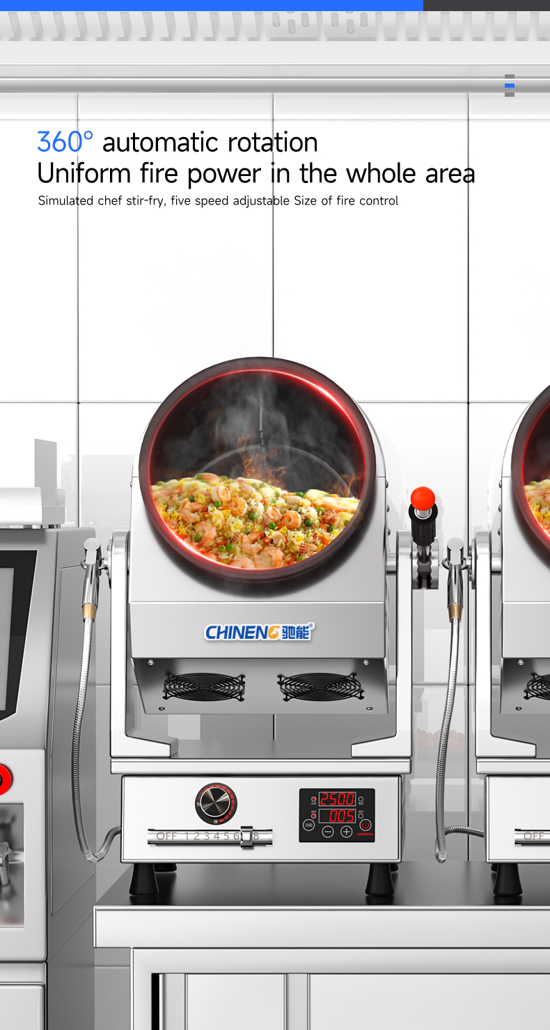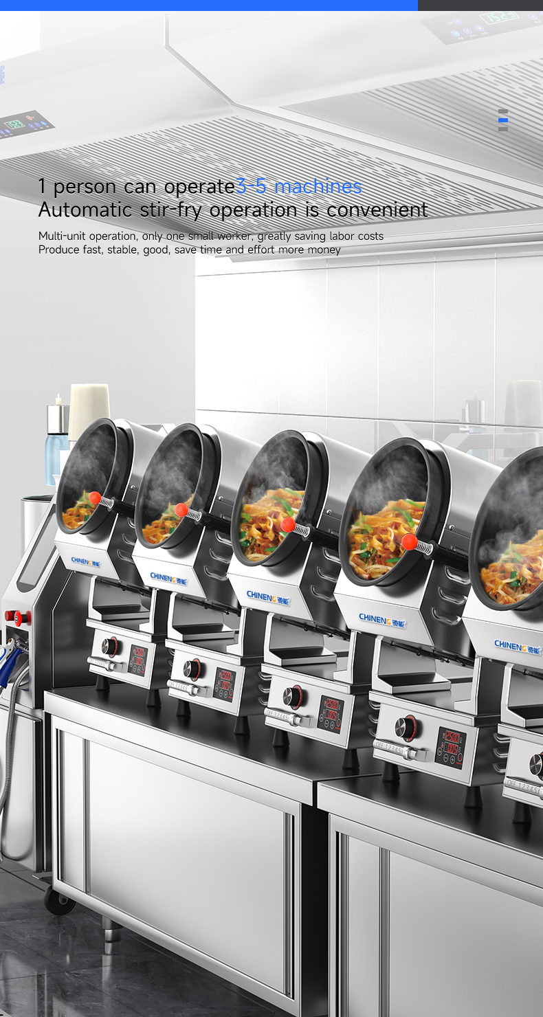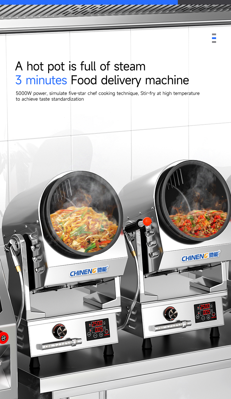 Electric control tilting + emergency stop function + infrared testing + storage for 800 recipes (intelligent learning function) + real-time voice broadcast + three automatic seasoning ports