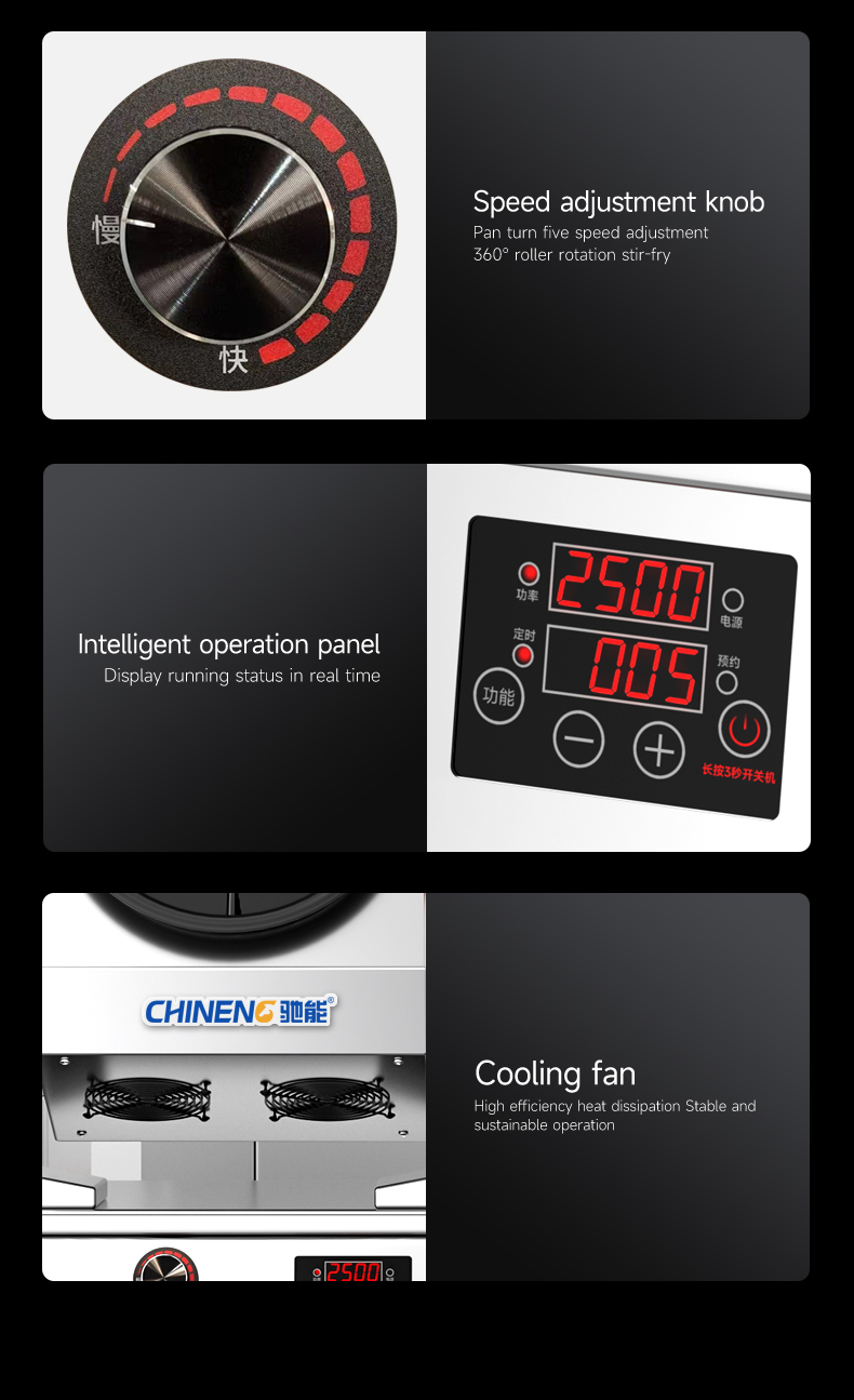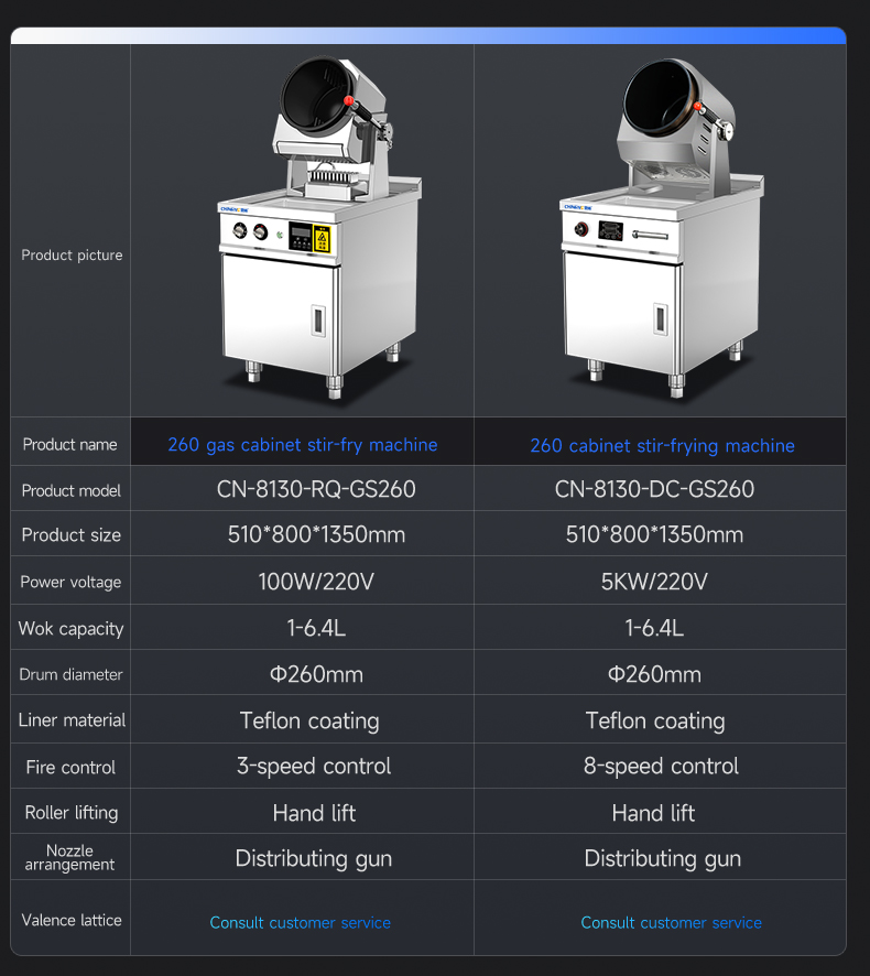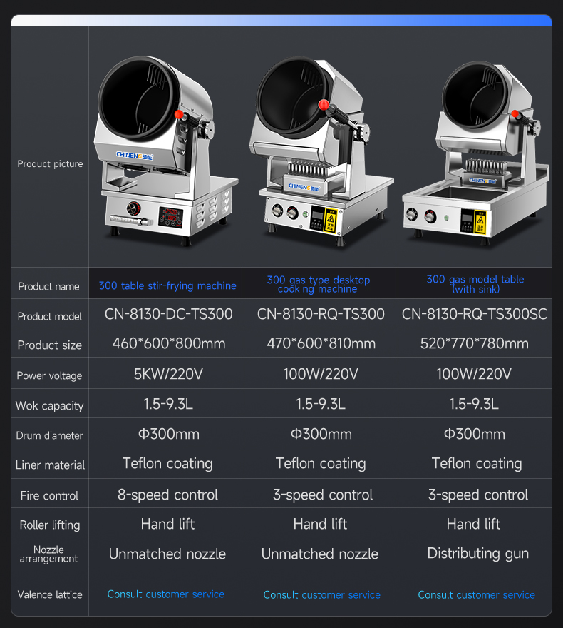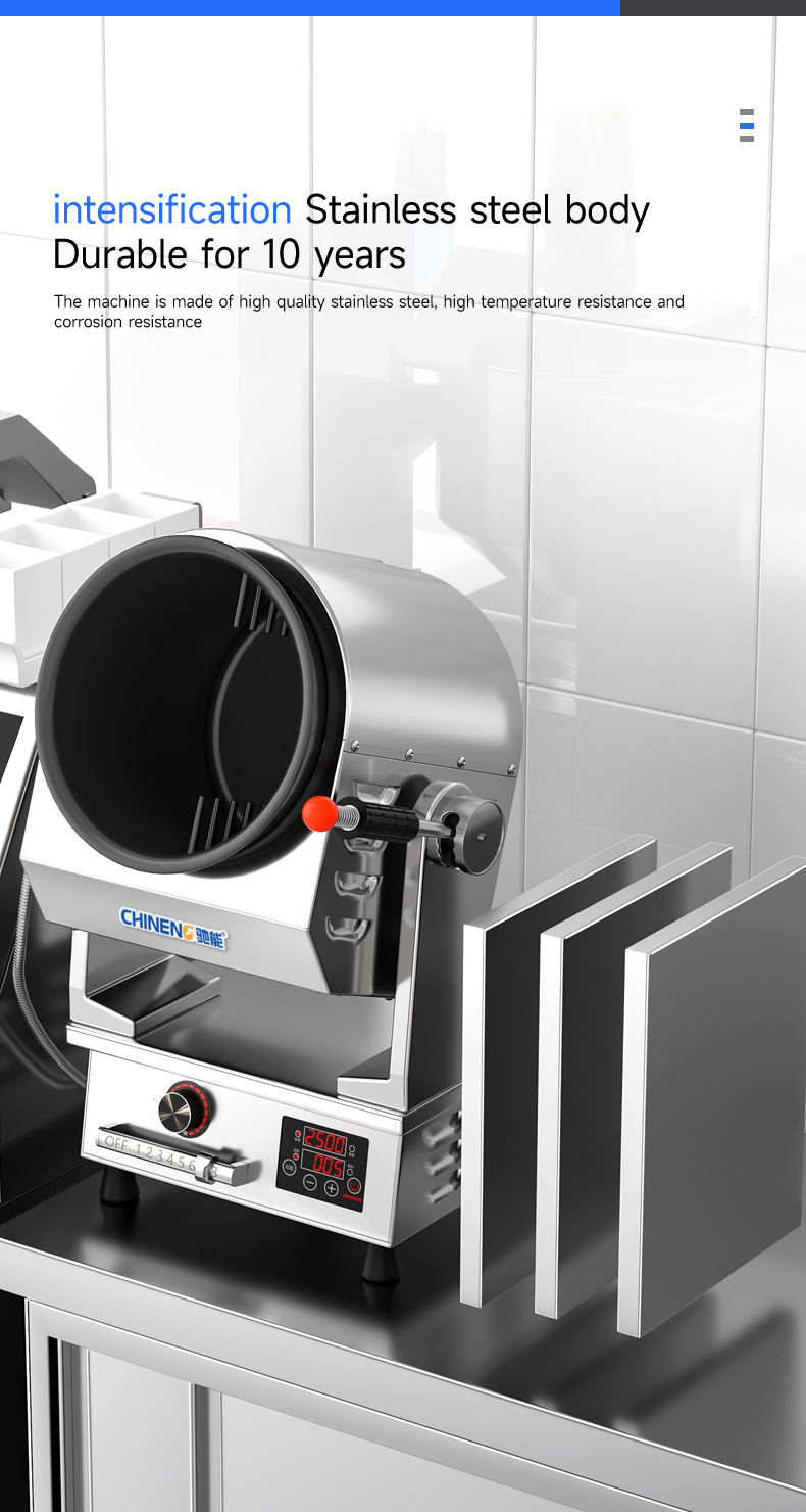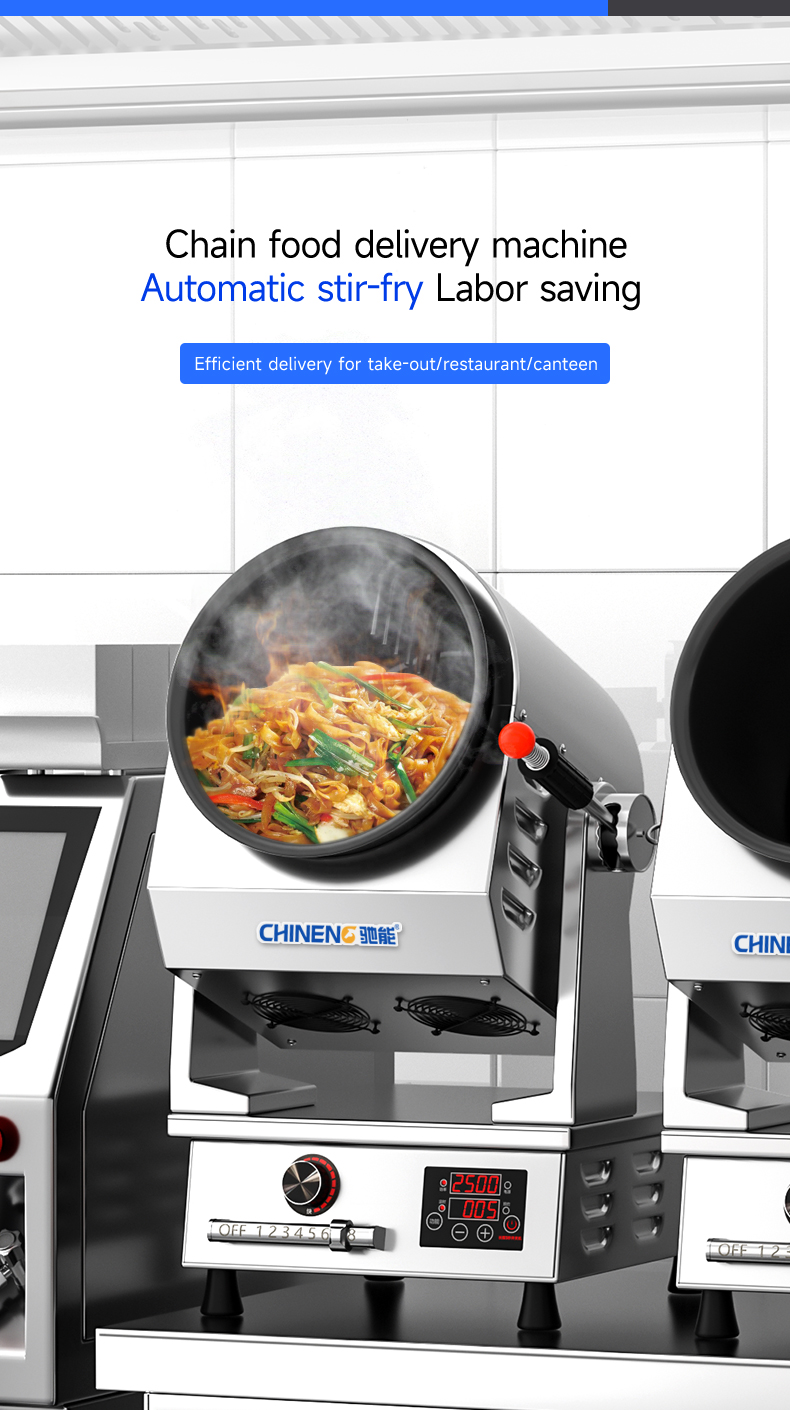 Electric control tilting + emergency stop function + infrared testing + storage for 800 recipes (intelligent learning function) + real-time voice broadcast + three automatic seasoning ports